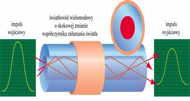 W światłowodzie tego typu współczynnik załamania zmienia się skokowo pomiędzy rdzeniem a płaszczem. Mody prowadzone są w rdzeniu pod różnymi kątami, przez co mają różną drogę do przebycia. Prędkość światła zależy od ośrodka, w którym światło się rozchodzi: w próżni ta prędkość wynosi 300 000 km/s a w światłowodzie 200 000 km/s, dlatego czasy przejścia promieni przez mody światłowodu są różne.